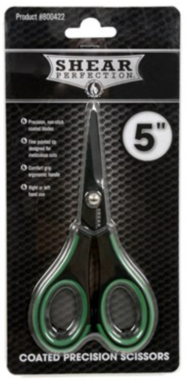 Shear Perfection® Precision Blade Scissors are specifically designed with one thing in mind, precise cuts. The non-stick coating helps make use and cleaning easier. These scissors feature very sharp blades and an extremely fine point. This, along with the smaller size of these scissors, give them an advantage over other scissors for fine trimming and pruning. They are made with excellent quality Japanese stainless steel and have rubber feel comfort grip handles. These scissors are perfect for both right and left handed users. Overall length is 5 in.